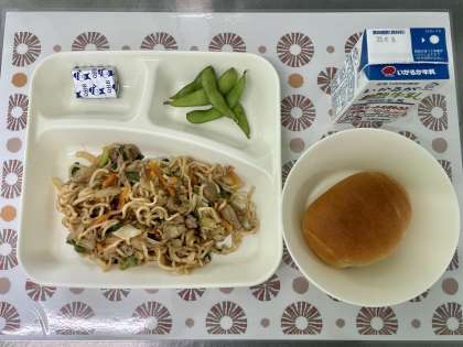 今日の献立は、オイスターソース焼きそば・えだまめ・固形チーズ・黒糖1/2パン・牛乳です。