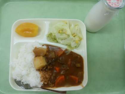 牛乳・ハヤシライス・野菜サラダ・黄桃です。
