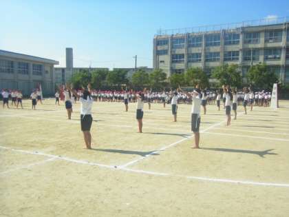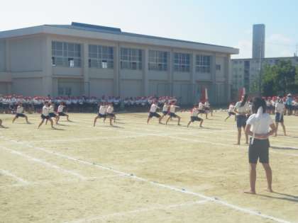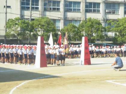 10月1日、晴れ渡った空の下、10月6日の運動会に向けて、最後の全体練習が行われました。最初に入場行進です。最初の練習よりもかなり上手に行進できました。