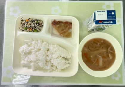 今日の献立は、あかうおのおろしじょうゆかけ・みそ汁・高野どうふのいり煮・ごはん・牛乳です。