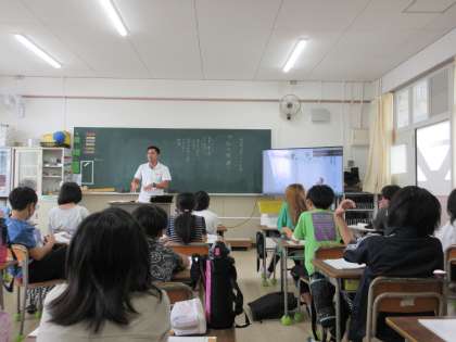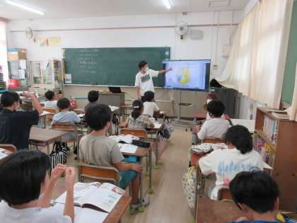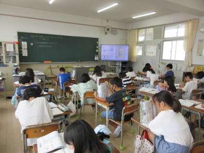 〇5年1組では道徳で「和太鼓調べ」を学習していました。わが町の誇りと伝統についての学習ですが、子どもたちからは「東井高野の太鼓もがんばっている!」と発言がありました。5年2組の教室では社会科「米はどのように消費者に届けられるのでしょうか。」のテーマで学習をしていました。山形県産のコメの流通の約6割は関東地方へのもので、近接地で消費される特徴を学んでいました。