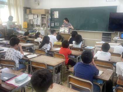 1冊目の絵本は、「うちゅうじん いない⁈」という絵本でした。1年生の子どもたちは、宇宙人はいると思う?」の問いかけに「いる!」と言っている子が多くいました。