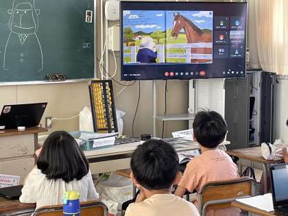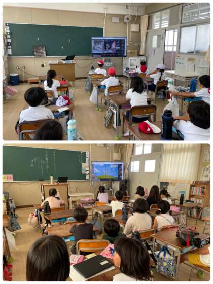 今日は1年1組の教室から教室から読み聞かせ隊のみなさんが絵本を読み、各教室に放送しました。