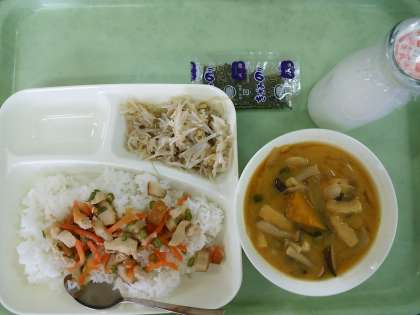 牛乳・かやくごはん・みそ汁・もやしの甘酢あえです。