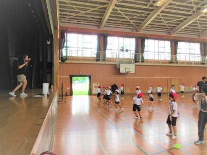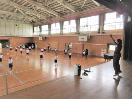 1年生も3年生も先生の手本をしっかりとみて、楽しく団体演技の練習を行っていました。