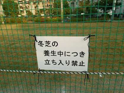 2週間ほどたつと、冬芝の芽が出、緑色になっていくことでしょう。その間、芝の立ち入りが禁止になりますので、よろしくお願いします。