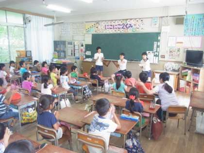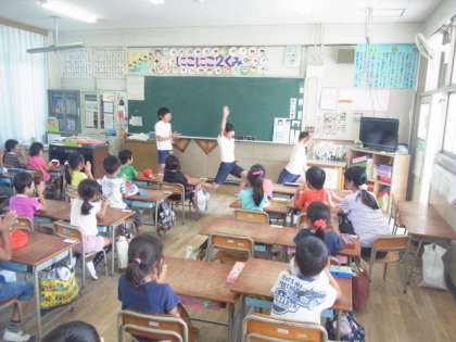 昼休み、応援団が3人くらいに分かれて、各クラスに行きました。応援の仕方を教えるためです。白団団長が行った1年2組では、帽子の振り方から始まって、手拍子の仕方などを丁寧に行っていました。1年生の子どもたちも、にこにこしながら真剣に応援の練習をしていました。