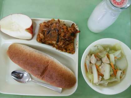パン・牛乳・なすのミートグラタン・鶏肉と野菜のスープ・りんごです。