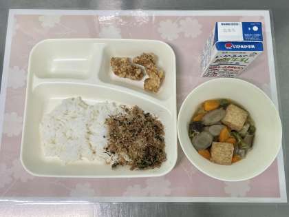今日の献立は、鶏肉のたつたあげ・あつあげと野菜の煮もの・おかかなっ葉・ごはん・牛乳です。
