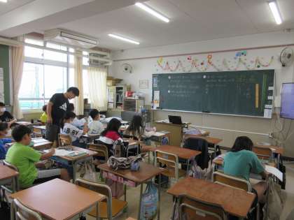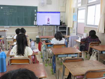 6年生は算数で拡大、縮小の学習をしていました。モニターで、ウルトラマンが拡大されたり縮小されたりする画面を見て、たて拡大縮小、よこ拡大縮小、たてよこ均等拡大縮小などを実感していました。