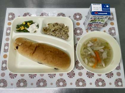 今日の献立は、豚肉のカレー風味焼き・鶏肉とやさいのスープ・さんどまめとコーンのサラダ【ノンエッグドレッシング】・レーズンパン・牛乳です。