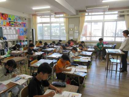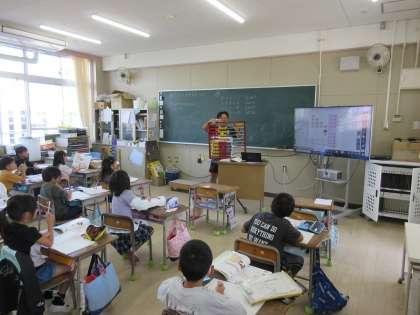 3時限目 2年生の教室では九九の学習に取り組んでいました。1組では覚えた九九をプリントにすばやく書き込んでいく学習、2組では3のだんの九九を「百玉そろばん」を使って視覚的に理解する学習に集中して取り組んでいました。