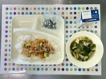 今日の献立は、ピリ辛丼・中華スープ・ミニフィッシュ・ごはん・牛乳です。