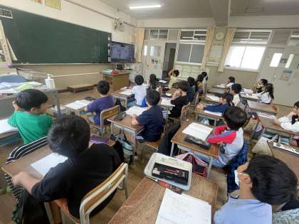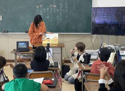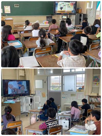 教室で聞いている子どもたちも読み聞かせ隊のみなさんといっしょに声を合わせて楽しみました。