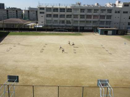 4年生2組は、運動場でハードル走の仕上げです。みんな、ずいぶんハードル走のコツをつかんできたみたいですね。