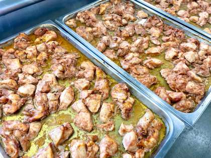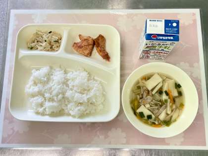 今日の献立は、鶏肉のチリソース焼き・焼き豚とワンタンの皮のスープ・切干しだいこんのごま辛味づけ・ごはん・牛乳です。