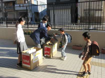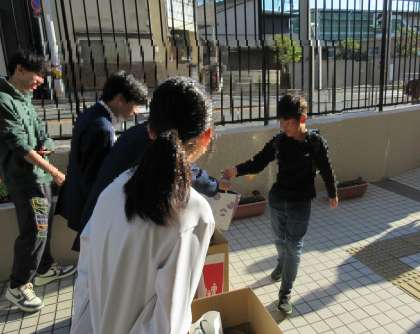 今朝は、昨日お知らせした中学生徒会の「着なくなった子ども服を難民の子どもたちに届ける取組み【届けよう 服のチカラプロジェクト】」の1日目でした。中学校生徒会から4名の生徒が来校して服の回収をしていました。