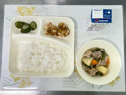 今日の献立は、あげどりのねぎだれかけ・豚肉とじゃがいもの煮もの・きゅうりの赤じそあえ・ごはん・牛乳です。