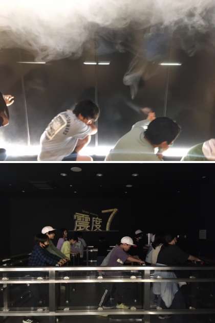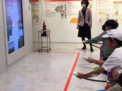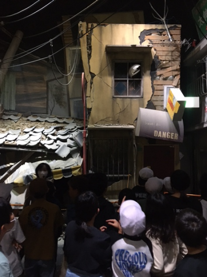 一つ目の目的地は阿倍野防災センター「あべのタスカル」でした。模擬消火器での消火訓練、煙の中を避難する煙中訓練、地震の揺れを体験する震度7体験などを通して、災害や防災の知識を深めることができました。