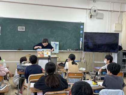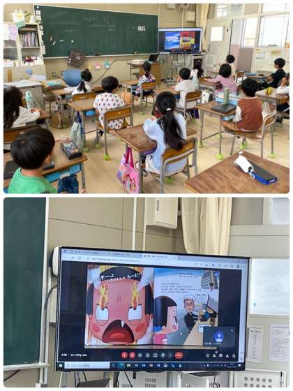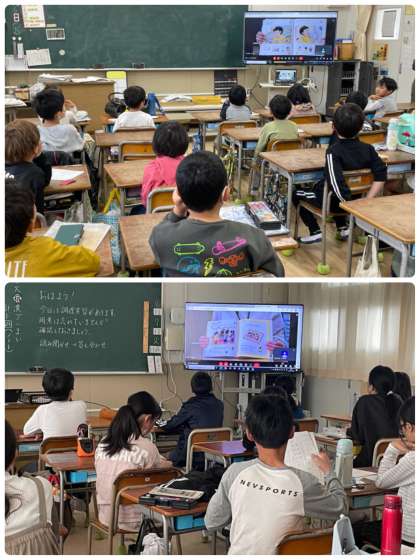 今日は5年2組の教室から読み聞かせ隊のみなさんが絵本を読み、各教室に放送しました。