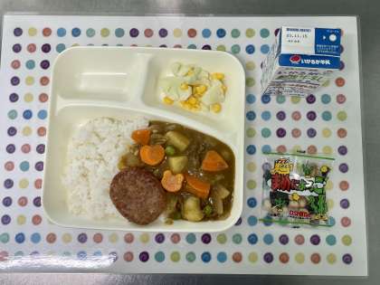 今日の献立は、ハンバーグカレーライス・カリフラワーのピクルス・豆こんぶ・ごはん・牛乳です。