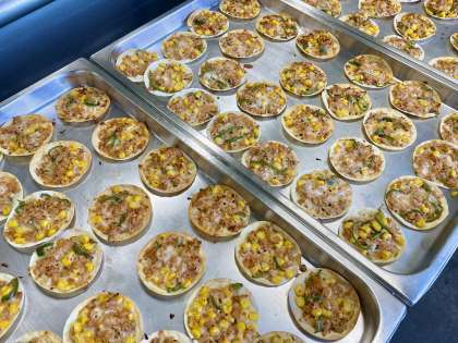 変わりピザは、毎回大人気の献立です。パリッとした食感のぎょうざの皮の上に具材が乗っていて、とてもおいしかったです。