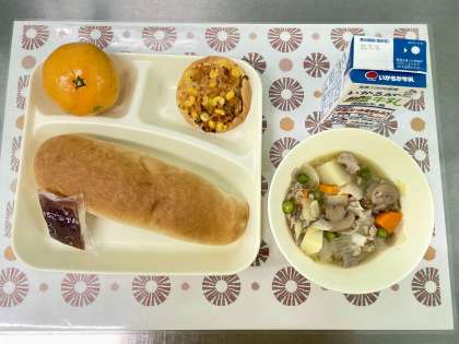 今日の献立は、豚肉と野菜のスープ煮・変わりピザ・みかん・大型コッペパン・いちごジャム・牛乳です。