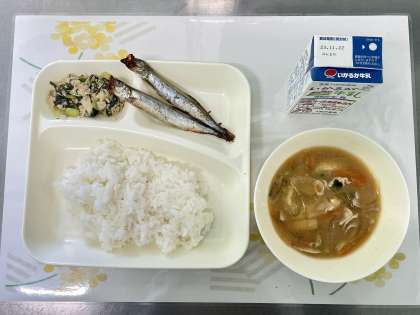 今日の献立は、焼きししゃも・みそ汁・こまつなのいためもの・ごはん・牛乳です。