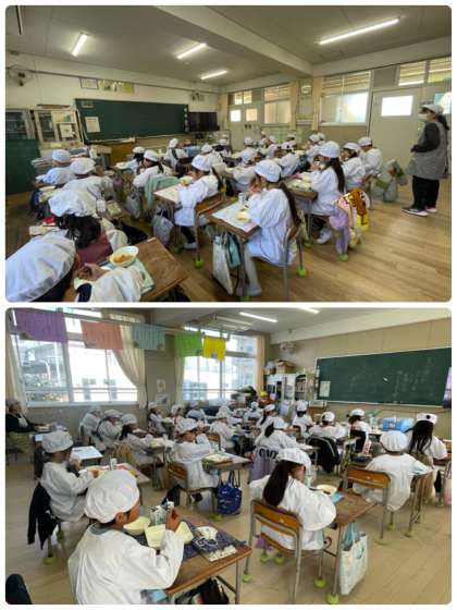 焼きししゃもは、脂がのった大きなししゃもでした。こんがりと焼き色がついていて、中には魚卵が入っているししゃももあり、頭から尾までしっかりよくかんで食べている児童が多くいました。