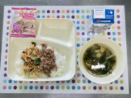 今日の給食は、ビビンバ・わかめスープ・いもけんぴフィッシュ・ごはん・牛乳です。