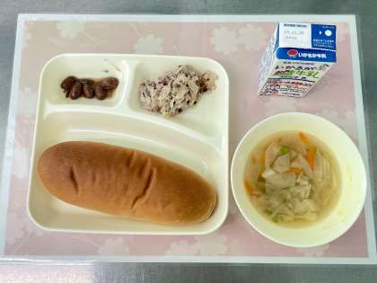 今日の給食は、豚肉のバジル焼き・スープ・うずら豆のグラッセ・黒糖パン・牛乳です。