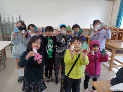図工室で、クリスマス飾りのツリーと雪だるまにペイントをし、乾かしたあとでステンシルやシールなどで飾り付けをしました。素敵な作品ができましたね。