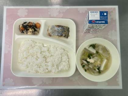 今日の献立は、さごしのごまじょうゆかけ・うすくず汁・大豆の煮もの・ごはん・牛乳です。