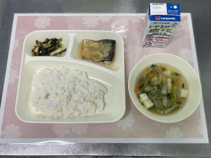 今日の献立は、さばのみぞれかけ・すまし汁・こまつなの煮びたし・ごはん・牛乳です。