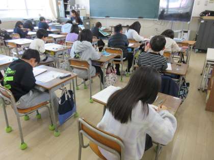 2日目の今日は算数科と理科、英語(5・6年生のみ)のテストが行われました。