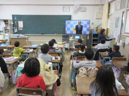 今日は小春日和の月曜日でしたが、運動場が使えないので放送で児童朝会を行いました。