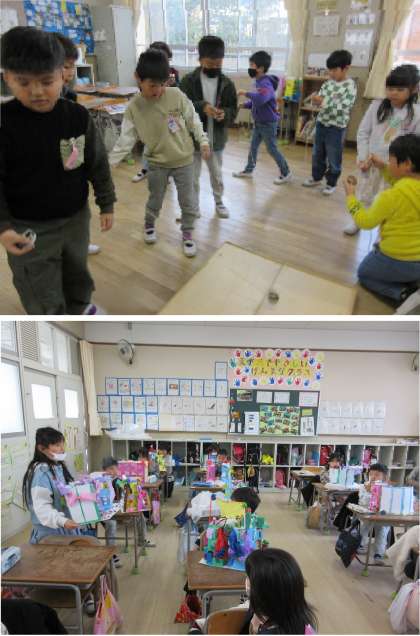 2年2組は、図工の作品の発表会をしていました。制作した立体作品を見せながら、工夫したところや頑張ったところを紹介していました。その後、友だちの感想も聞けて、みんな嬉しそうでした。
