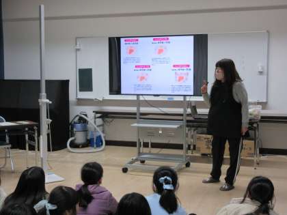 測定前に保健室の先生から保健指導がありました。今日は「腸内環境」の話でした。自分の生活を振り返ってチェック項目にチェックし、自分の腸年齢を知ります。多くチェックがついた子は、腸年齢がプラス30歳…つまり42歳の腸となっていました(ショック?!)生活改善で腸年齢は若くなるので、がんばってください。
