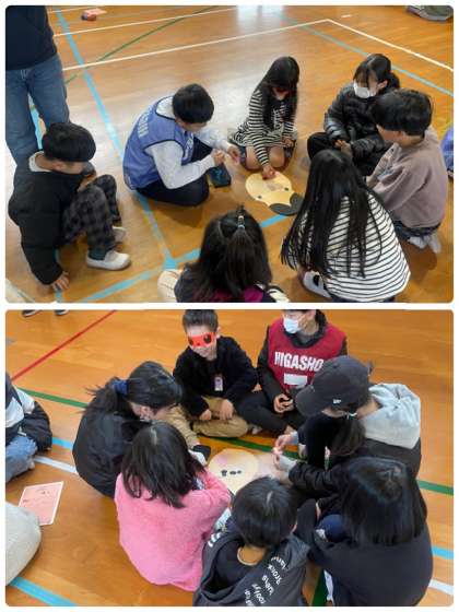 各たてわり班に分かれ、目隠しをしながら福笑いの顔の台紙に、まゆ、目、鼻、口、ほっぺをそれぞれ並べる昔から知られているお正月の遊びの一つです。