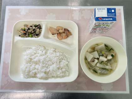 今日の献立は、鶏肉の甘みそ焼き・五目汁・高野どうふのいり煮・ごはん・牛乳です。