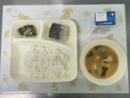 今日の献立は、さごしのしょうゆだれかけ・とうふのみそ汁・みずなの煮びたし・ごはん・牛乳です。