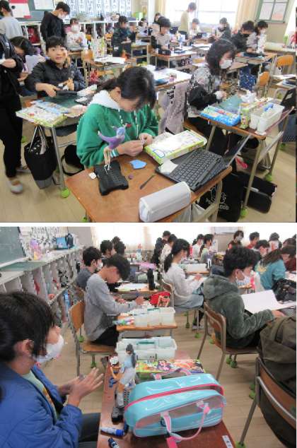 6年の教室では、図工の学習で、芯材に紙粘土で肉付けをしたり絵の具で着色したりして、動きのある人物を制作していました。自分自身をモデルにしたり、憧れのスポーツ選手をモデルにしたりして、思い思いの作品制作に集中して取り組んでいました。