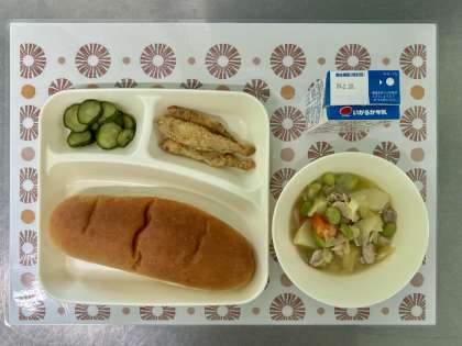 今日の献立は、わかさぎフライ・洋風煮・きゅうりのピクルス・黒糖パン・牛乳です。