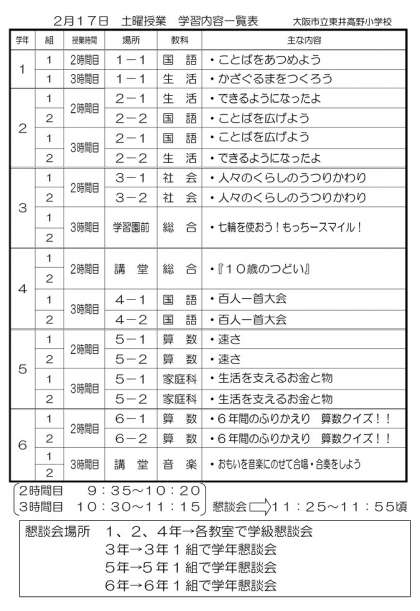 ※2/17(土)の児童の登校は通常通り(8:10〜8:25)です。また、2/19(月)は代休でお休みです。