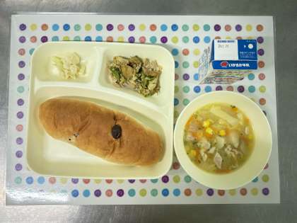 今日の献立は、豚肉のカレー風味焼き・コーンとはくさいのスープ・カリフラワーのレモンドレッシング・レーズンパン・牛乳です。