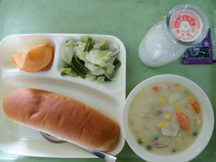 パン・牛乳・コーンクリームシチュー・キャベツと三度豆のサラダ・かきです。