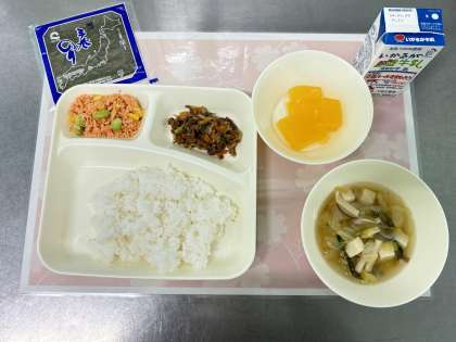 手巻きご飯(牛肉のコチジャンいため、さけのカラフルそぼろ)・すまし汁・ダイスゼリー・ごはん・牛乳です。