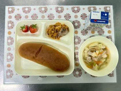 今日の献立は、とうふのミートグラタン・じゃがいもと野菜のスープ・いちご・黒糖パン・牛乳です。
