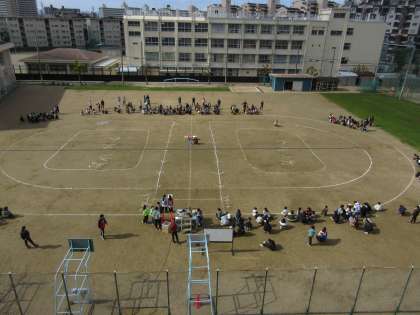 各色のグループで、お題に合う人を見つけて朝礼台まで連れてくる競技です。先生や1年生、仮装をしている人など、運動場をみんなで探しまわり得点していきました。