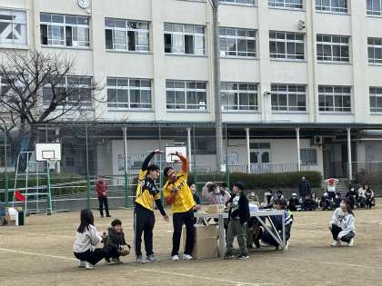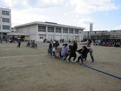 低学年グループ・高学年グループに分かれて、協力してつなひきをしました。トーナメントを勝ち上がったチームは、先生チームとボーナス得点をかけて勝負しました。子どもたちの絆の前に、先生チームは2連負でした。